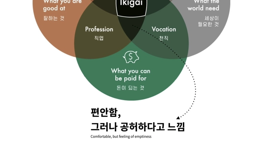 IKIGA: 아침에 눈 뜨는 이유 당신은 아침마다 설레는 마음으로 눈을 뜨고 있는가? 만약 설레는 일을 아직 찾지 못했다면 이 '이키가이 벤다이어그램'을 통해 자신만의 존재의 이유'를 찾아보기 바란다. 이 벤다이어그램은 총 4개의 동그라미로 이루어져 있는데, 각각의 동그라미는 좋아하는 것•잘하는 것•돈이 되는 것 세상에 필요한 것에 해당하는 '무언가'가 들어간다. 이 4개의 동그라미를 하나씩 채우며 자신만의 '이키가이'를 찾아보자.