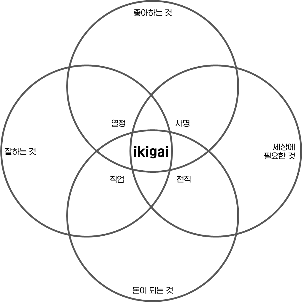 아침마다 설레는 마음으로 눈을 뜨기 위해서는 반드시 네 가지 요소를 모두 포함한 일을 찾아야 한다는 것이 이키가이의 정신이다.